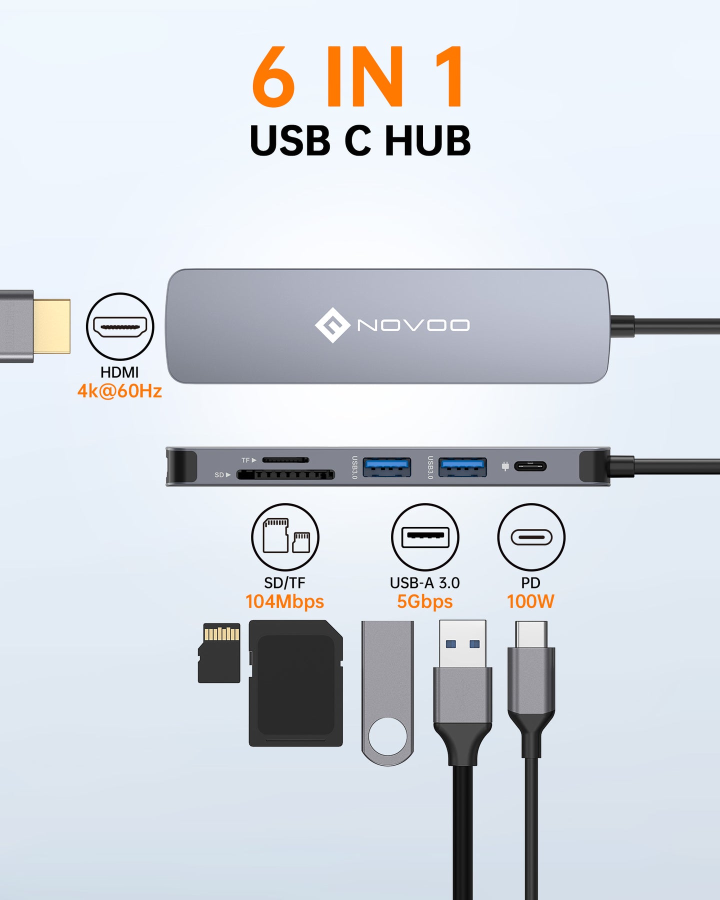 4K@60Hz HDMI + USB C PD 100W Charging Port + USB3.0 Port x2 + SD & TF Card Reader