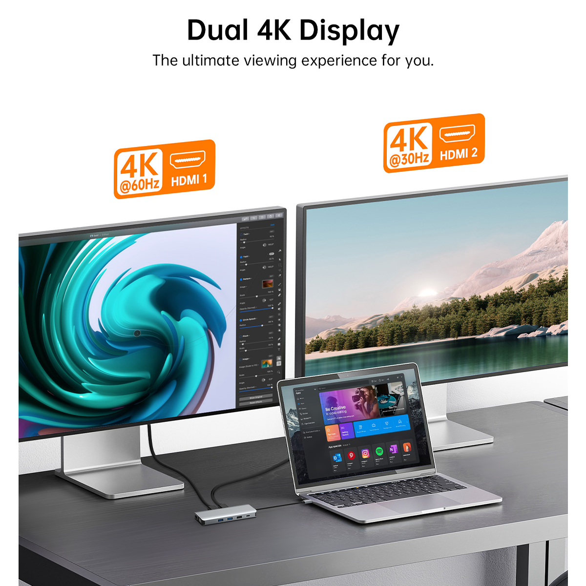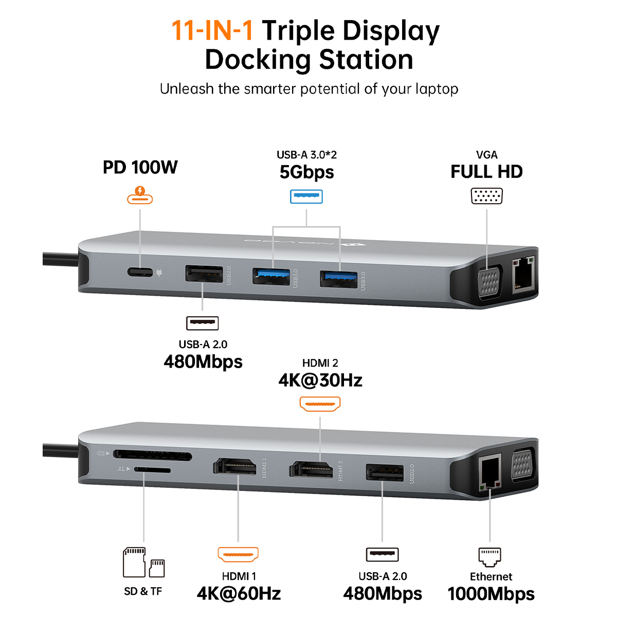 4K HDMI x2 + VGA 1080P + USB-C PD 100W Port + USB3.0 Port x2 + USB2.0 Port x2 + SD&TF Card Reader Slot + 100/1000Mbps Ethernet